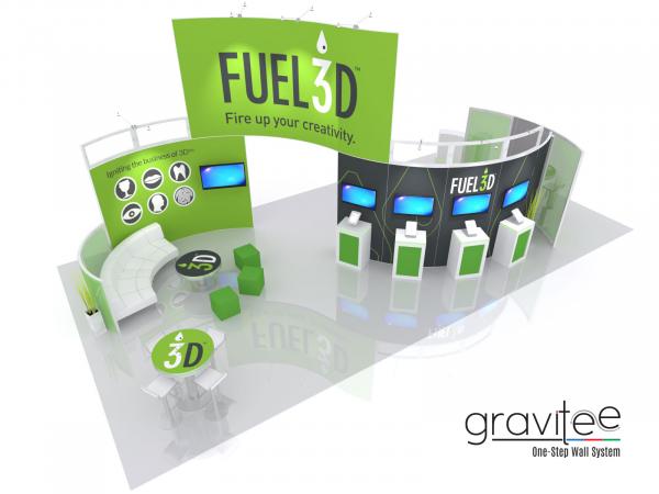.jpg) It's the complete package. There's no better way to describe the  re-configurable GK-5148, GK-5147, and GK-2987. The GK-5148 and GK-5147  islands maximize the available space with double-sided curved panels.  The design includes iPad workstations, monitor mounts, and a  presentation area. There's an attractive custom reception counter with a  backlit graphic and LED accent lights. In addition, the islands have  multiple seating areas all with wireless charging pads so your clients can  charge their phones and tablets. All the curved panels are from the  patented Gravitee System, so individual panels connect without tools and  there are no loose parts or pieces.