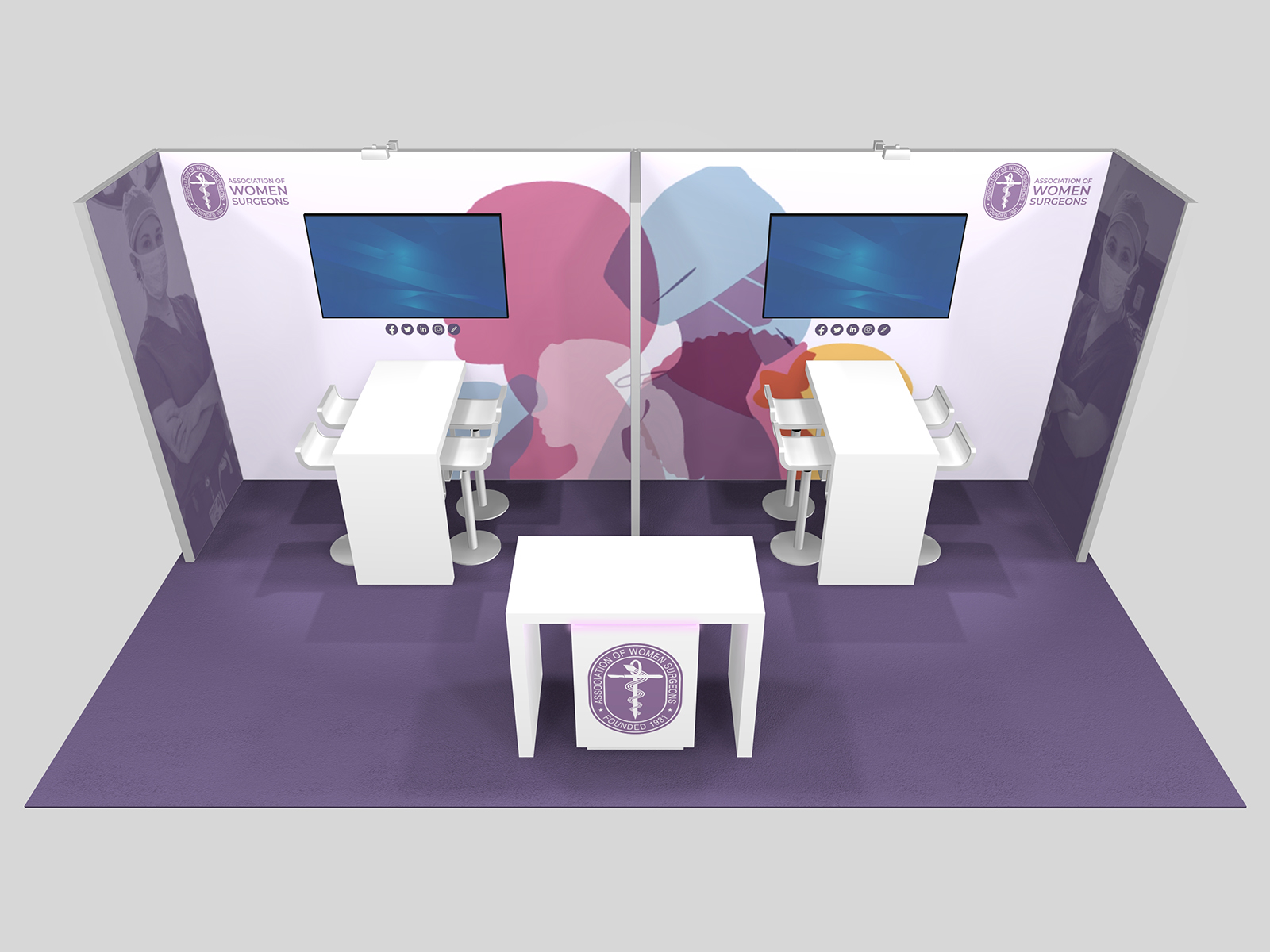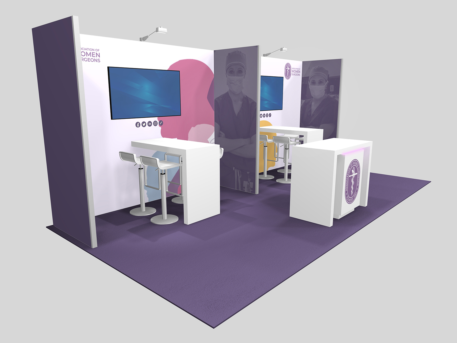 Quite often, a few custom elements added to the design can give the entire design a custom look even if it’s as simple as some colorful laminated workstations, shelves, or a reception counter. Custom laminated soffits and backlighting are also nice touches that are inexpensive and well worth the investment. As a bonus, if you re-rent the same exhibit, your second rental will most likely be less expensive, since your first rental covered the cost of those custom components.