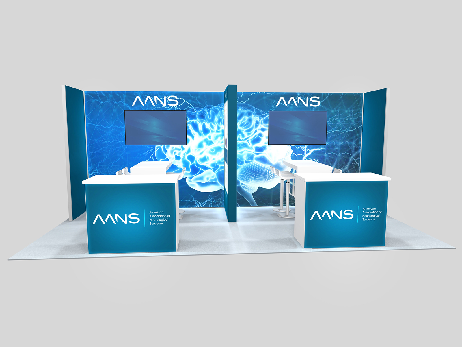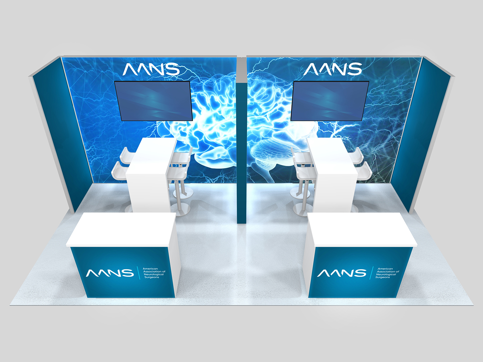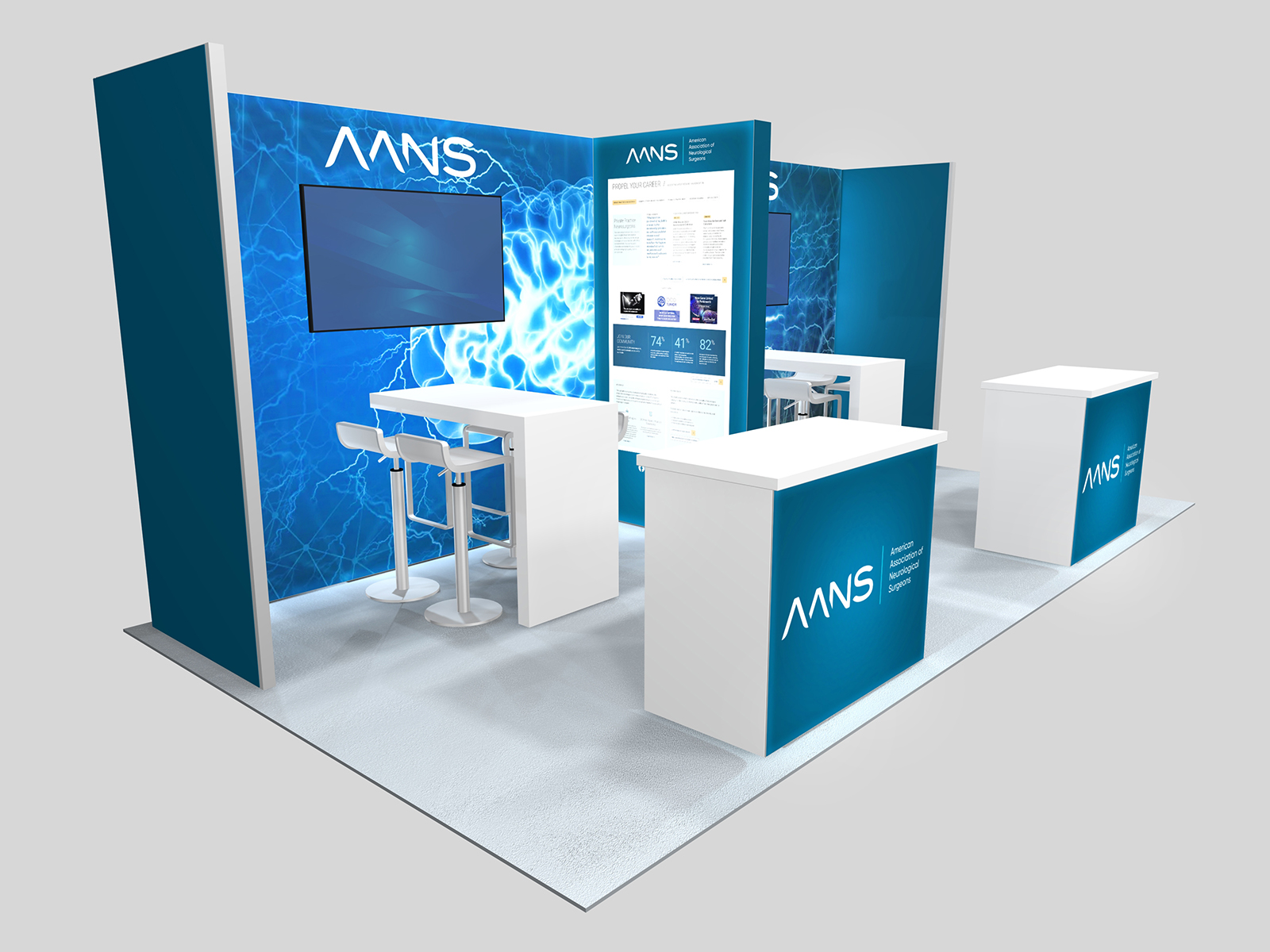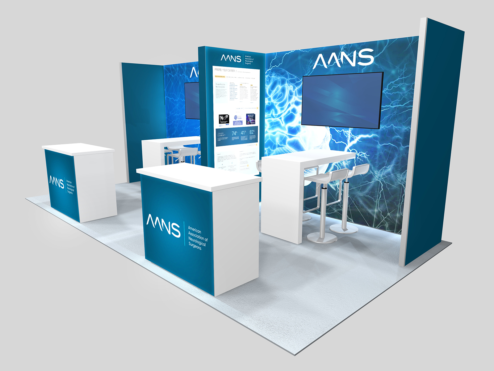 Quite often, a few custom elements added to the design can give the entire design a custom look even if it’s as simple as some colorful laminated workstations, shelves, or a reception counter. Custom laminated soffits and backlighting are also nice touches that are inexpensive and well worth the investment. As a bonus, if you re-rent the same exhibit, your second rental will most likely be less expensive, since your first rental covered the cost of those custom components.